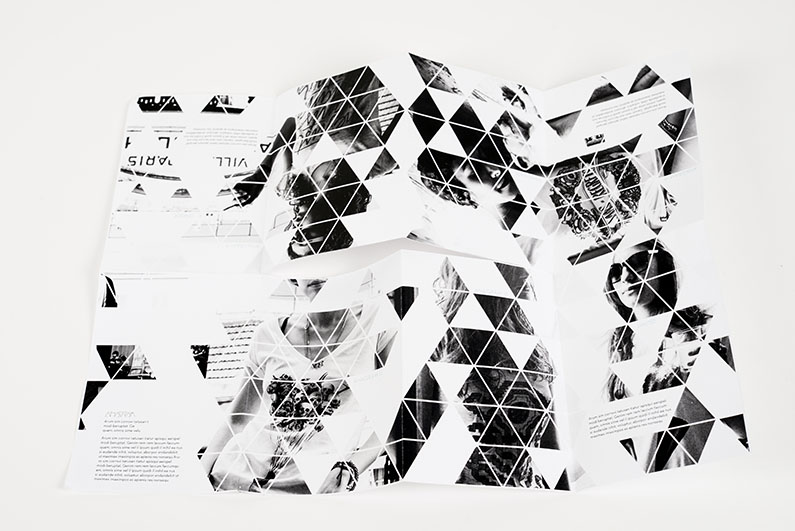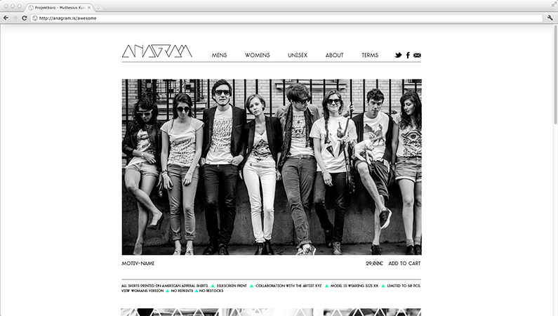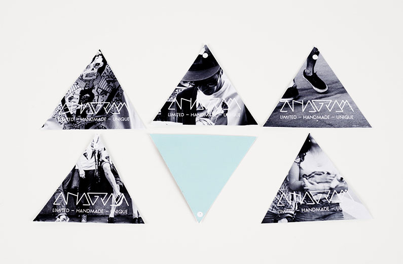 Anagram is a t-shirt label for tshirts, which are made of screen printing. An anagram is something that always consists of the same as the original, but which is newly transformed and reinvented. This is the principle of our label as well. Unique, handmade, in limited edition are the three most important words. Hence, the logo of triangles was constructed and also the design of the triangle is a central form. All pictures in the booklet are rasterized into triangles; the image information of each triangle can be on or off. Thus, each booklet is unique. The Booklet itself is a folded A3 to A6 sheet. If you unfold the sheet you get a poster. On the back of the poster is a screen printing of Shirt motif that you have ordered. Made in collaboration with Benedikt Schipper.