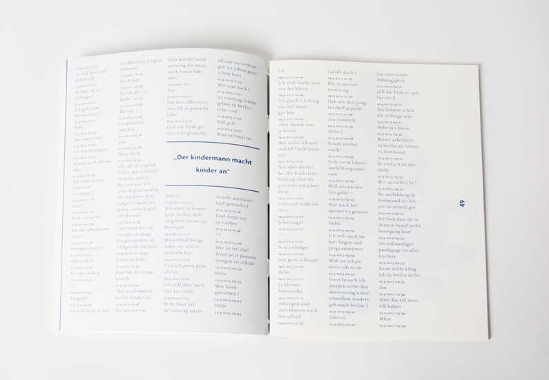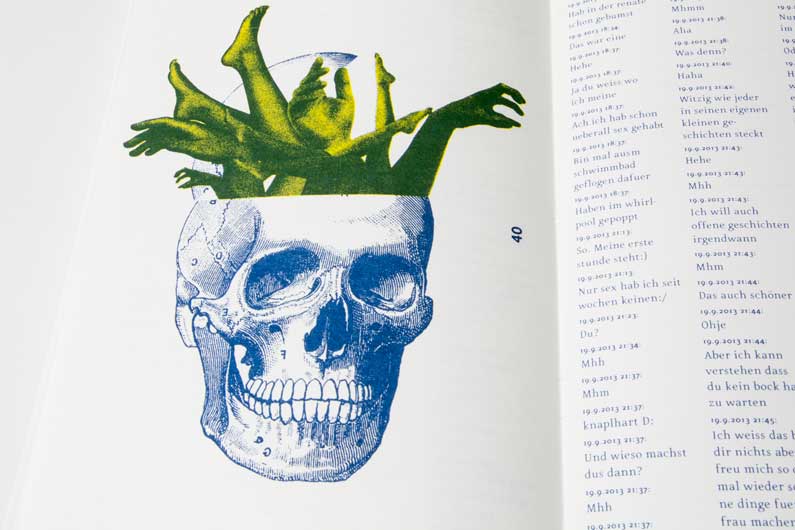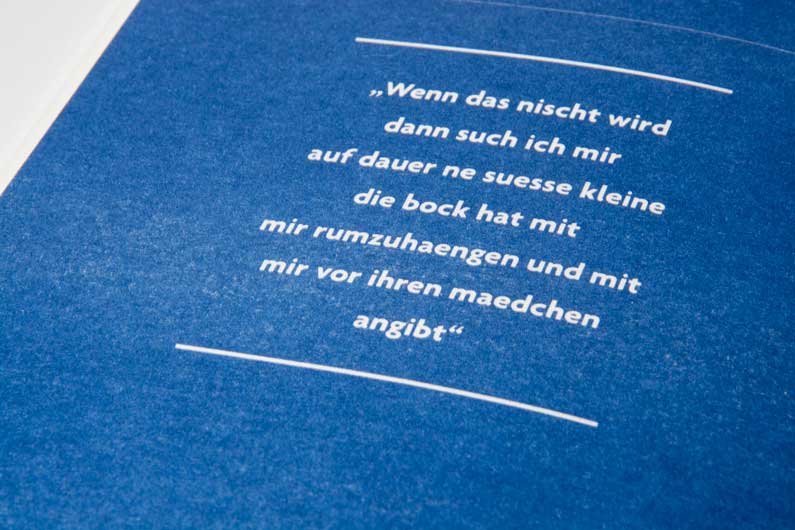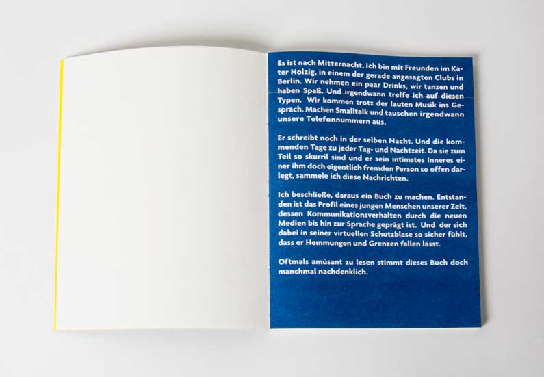 I finally decide to make a book out of his quotes. The result is a profile of a young man whose communication behaviour is influenced by the new media and the language of our daily life. He feels protected in his virtual digital bubble so that he looses all inhibitions and limitations.